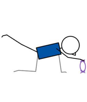 From tabletop position place one hand on top of circle vertical out in front of you. Extend back leg parallel to floor. Lower foot. As you lift it back up, press down on circle. Keep core active to not arch the spine.
